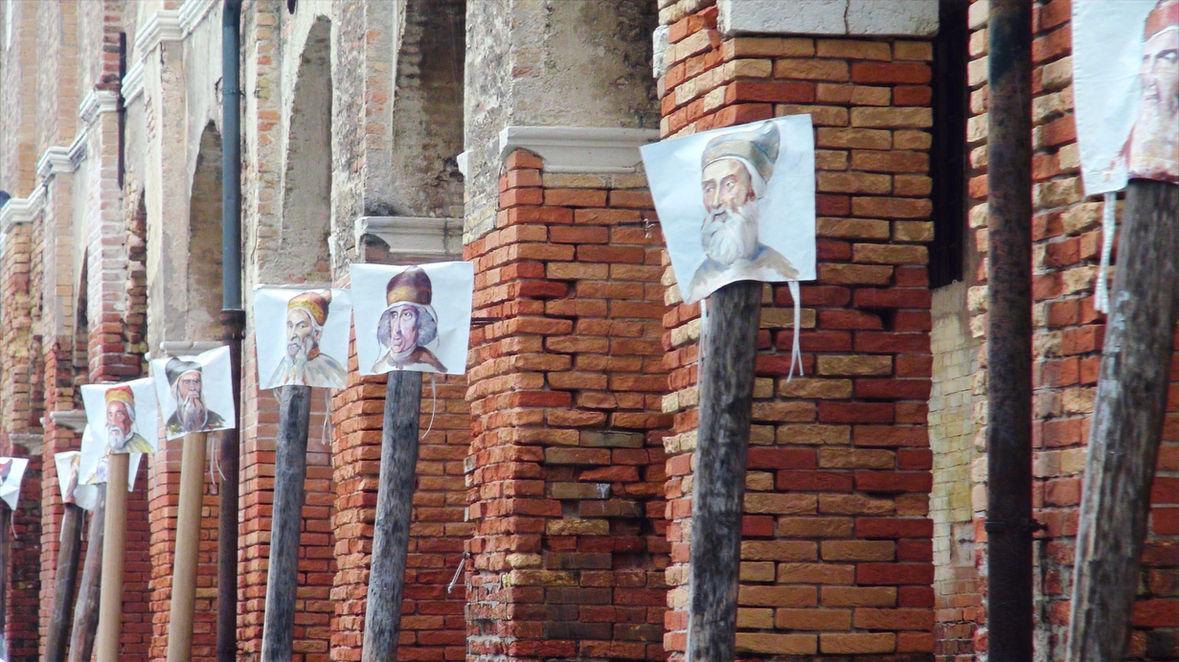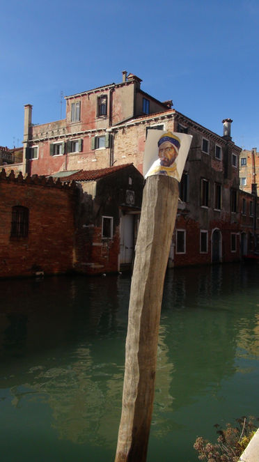 The Doges contemplate their city one last time before leaving. During the last of weekend of Venise's biennale, I created my Biennale off. The astonishing aqua alta event, happening simultaneously, granted this performance with a particular dimension. Painted on a coated canvas covers, the 14 pictures of the Doges wandered around the city, worn by groups of tourists in the Piazza San Marco, rode boats on the Grande canale, stood over wooden poles, under the rain, drinking a coffee or a spritz. The journalist Marina Salvi covered this performance.